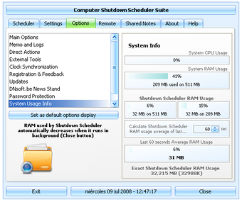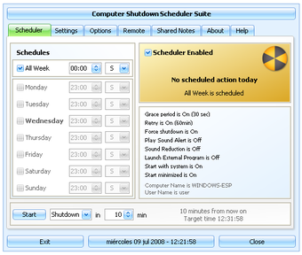 Puedes apagar tu ordenador manualmente o programar Shutdown Scheduler and Shared Notes para que lo haga cada día a una hora concreta o a horas distintas en determinados días de la semana, incluyendo ordenadores dentro de una misma red de trabajo.